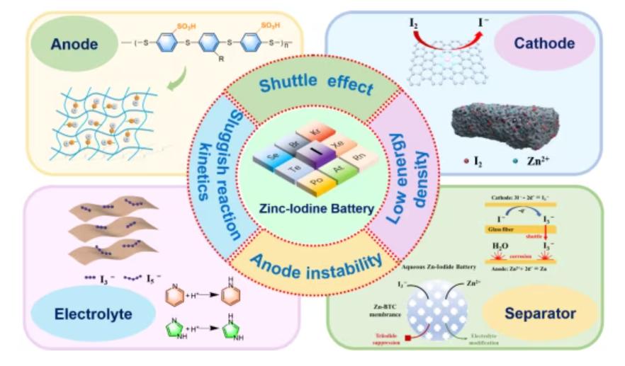 水系鋅基電池由于其成本低、安全性高、環境友好的特點,近些年引起了廣泛的研究興趣。鋅碘電池作為水系鋅基電池的代表之一,通過一種轉化反應機制實現電化學儲能,從而擺脫了傳統鋅離子電池主要依靠離子嵌入、脫出的儲能方式,避免了傳統鋅離子電池中正極材料結構坍塌的問題。此外,碘的低成本,多價態等性質以及較高的理論比容量(211 mAh g?1I2),使鋅碘電池有望成為下一代清潔、高效儲能器件的候選者之一。然而,鋅碘電池仍面臨著嚴重的多碘化物穿梭、緩慢的碘轉化動力學,低能量密度以及鋅陽極的不穩定性等問題,限制了鋅碘電池的大規模應用。除此之外,過去較少關注鋅碘電池中碘轉化機理,因此需要對鋅碘電池碘的電化學和轉化機理進行系統總結,為高效鋅碘電池的設計提供合理指導。
