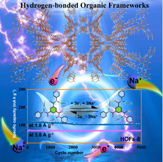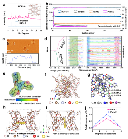 《用于長周期高倍率鈉離子有機電池的化學穩定的醛調諧氫鍵有機框架》的研究論文設計并制備了結構穩定且醛基調控的氫鍵有機框架(HOFs-8),其結構中含有用于鈉離子存儲的陣列式電負性位點。得益于靈活的氫鍵和獨特的結構對稱性,HOFs-8可實現活性位點的高效利用以及鈉離子和電子的快速傳輸。HOFs-8電極在電流密度為55 mA g-1時,表現出172.9 mAh g-1的高可逆容量,循環200次后容量保持率高達88.5%。在大電流密度3.66 A g-1下,它的循環壽命長達5000次,優于之前報道的大多數有機電極材料。通過原位FT-IR和原位XPS分析,詮釋了電極材料的鈉離子存儲機制。通過DFT理論計算證實了HOFs-8結構中Na+層間擴散的活化勢壘很低,這使得HOFs-8具有出色的倍率性能。這項研究為設計新型電極和改良型HOFs提供了啟示,它們將在儲能系統中將發揮巨大潛力。