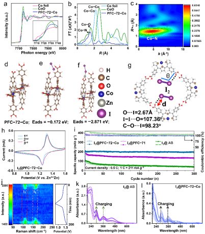 此外,同步輻射分析表明,PFC-72-Co中的Co為單原子金屬,中心價態為+2。Co-N配位距離為1.5 ?。原位拉曼光譜表明,鋅碘電池的氧化還原機制取決于I/I-的氧化還原反應,中間產物為I3-/I5-。原位紫外-可見(UV-vis)光譜進一步表明,HOFs可有效限制多碘化物的溶解。
