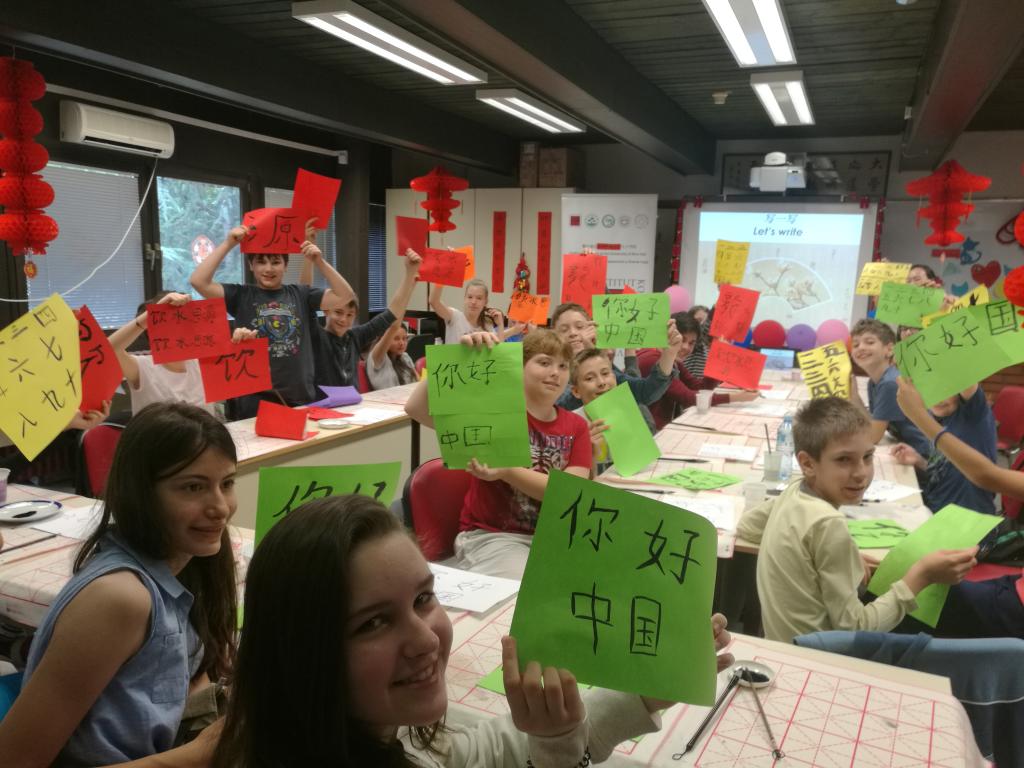 來自諾維薩德市圖書館的孩子們展示了提前制作的精美小彩報。彩報上工整地書寫著各自的興趣愛好和家庭成員,并貼有照片。小朋友揮動著手中的毛筆,在紙上有模有樣地寫著漢字“你好,中國”、“飲水思源”等,還樂此不疲地書寫漢語數字。他們表示喜愛漢字,對文房四寶興趣濃厚。隨后還進行了漢語歌曲K歌大賽,小朋友們猶如靈感迸發一般,一首接著一首,教室里激動的加油聲、爽朗的歡笑聲、嘹亮的歌聲交織成昂揚動聽的交響樂。